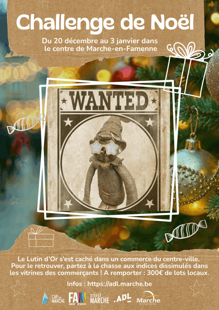 - Challenge de NoëlCette année, un nouveau défi vous attend : un lutin doré s’est caché dans l’un des commerces du centre-ville! Pour le retrouver, partez à la chasse aux indices dissimulés dans les vitrines des commerçants du centre-ville marchois. Observez, notez, décodez… et suivez la piste jusqu’au lutin doré ! Une fois découvert, il vous révélera la question mystère… Lire la suite : Challenge de Noël