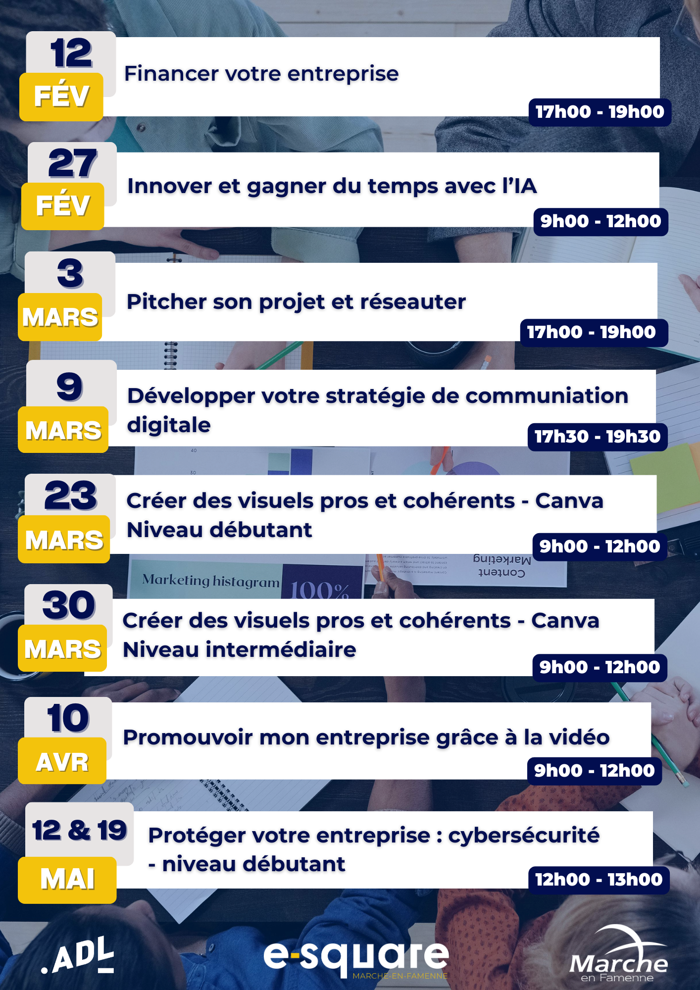 Organisé à l’e-Square, ce programme a été pensé pour répondre aux défis actuels des entrepreneurs : financement, intelligence artificielle, visibilité digitale, communication, cybersécurité…