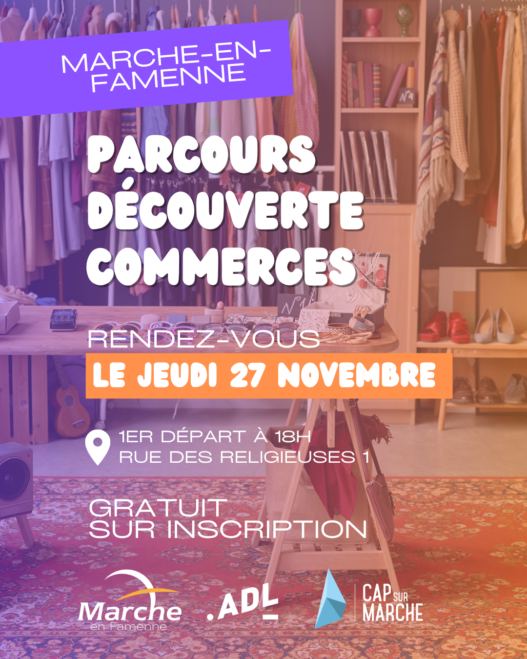 Le jeudi 27 novembre en soirée, un parcours pédestre découverte vous permettra de (re)découvrir certains nouveaux commerces du centre-ville de Marche-en-Famenne. De 18h à 19h, départ toutes les 15′, plusieurs commerçant.e.s vous ouvriront leurs portes pour présenter leurs produits et leur savoir-faire dans une ambiance conviviale. Une belle occasion de mettre en lumière la diversité et la vitalité du commerce marchois !